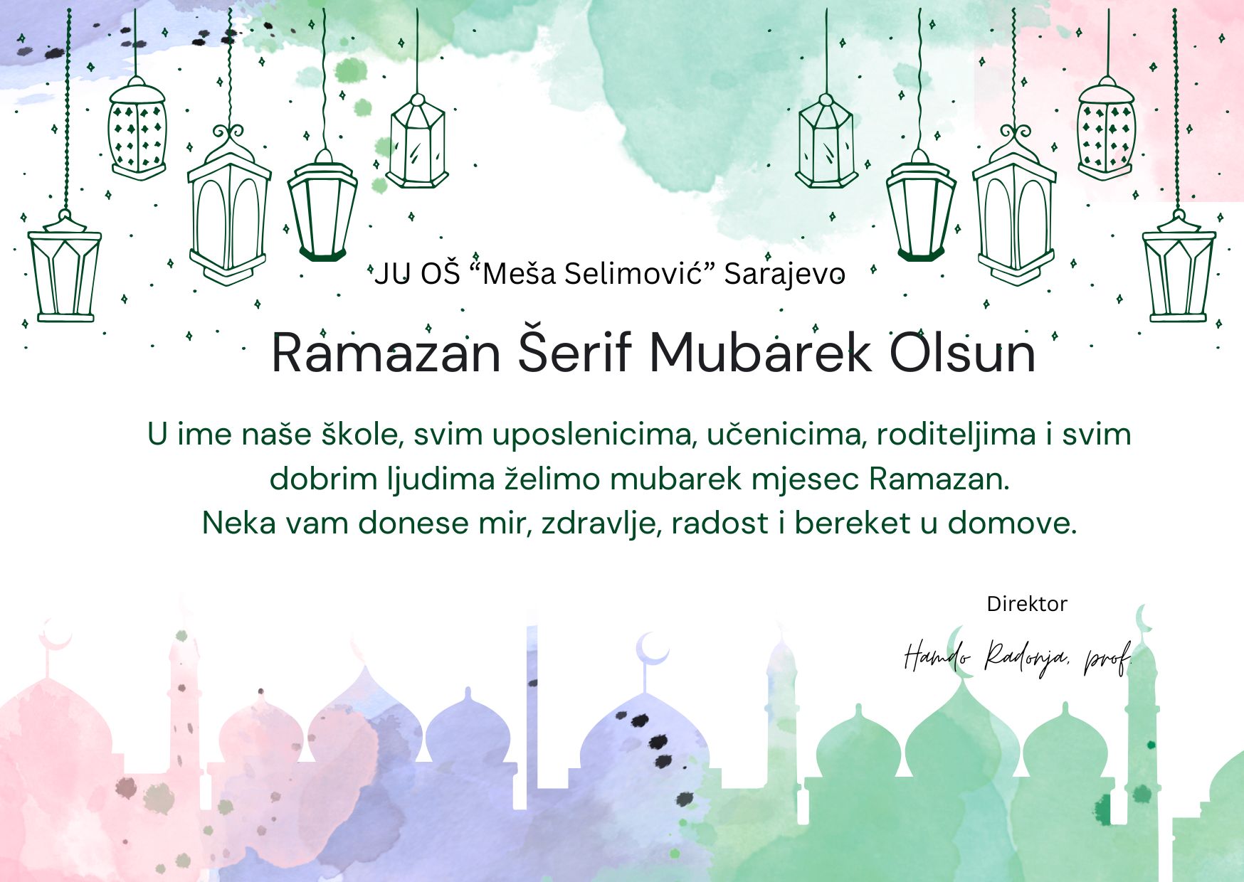Poštovani učenici, roditelji i uposlenici škole, povodom nastupajućeg mubarek mjeseca ramazana upućujemo iskrene čestitke svim učenicima, roditeljima i zaposlenicima islamske vjeroispovijesti. Ramazan je mjesec posta, strpljenja, dobročinstva[...]